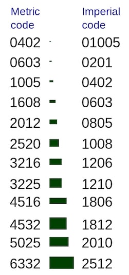 SMD package code for discrete components such as resistors, capacitors, and inductors. Image courtesy of Wikimedia.