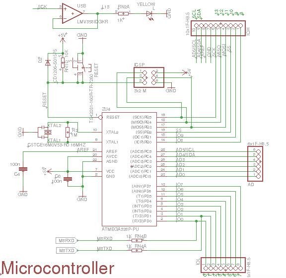From an electronic design perspective, this section is similar to microcontroller section. This MCU has an ICSP header, an external crystal with load capacitors (CL), and a Vcc filter capacitor.