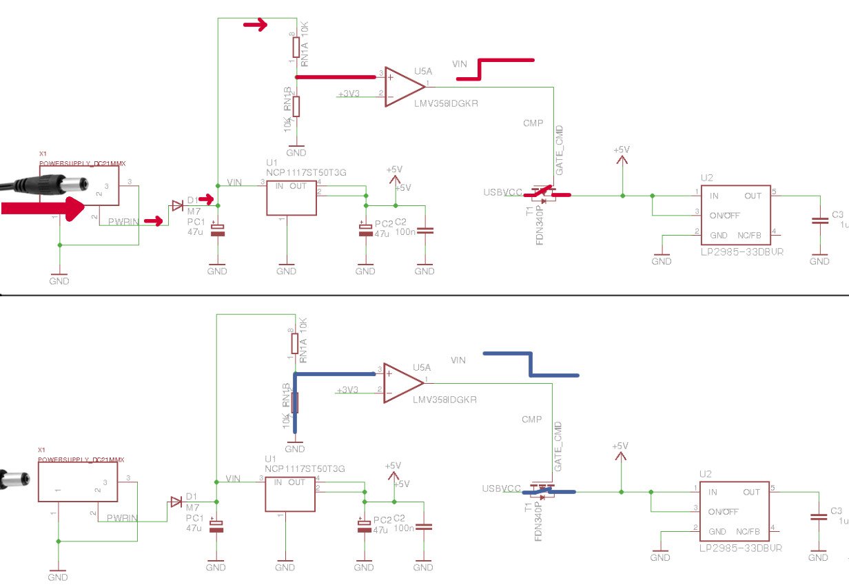 Another source of 5V is USBVCC which is connected to the drain of an FDN340P, a P-channel MOSFET, and the source is connected to the 5V net. The gate of the transistor is connected to the output of an LMV358 op-amp used as a comparator. The comparison is between 3V3 and Vin/2. When Vin/2 is larger, this will produce a high output from the comparator and the P-channel MOSFET is off. If there is no Vin applied, the V+ of the comparator is pulled down to GND and Vout is low, such that the transistor is on and the USBVCC is connected to 5V.