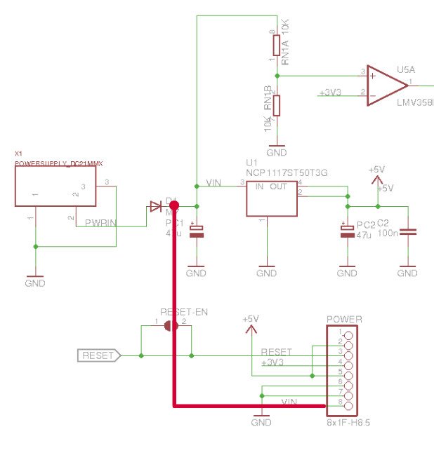 As mentioned above, VIN from a DC jack is protected from reverse polarity by using a serial M7 diode in the input. Be aware that the VIN pin in the power header is not protected. This is because it is connected after the M7 diode. Personally, I don’t know why they decided to do that when they could connect it before the diode to provide the same protection.