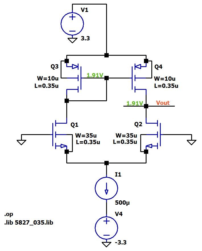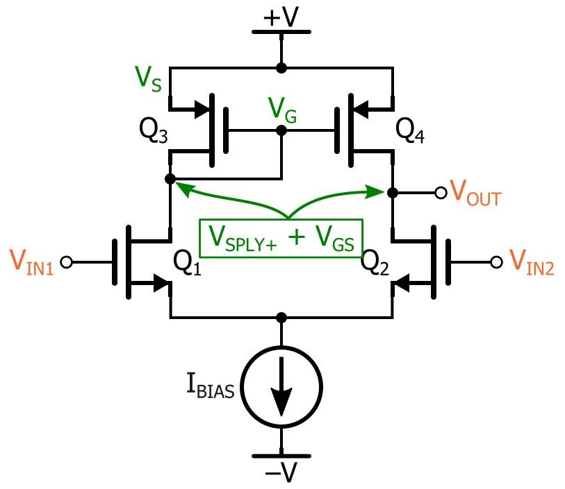 We have not yet discussed the small-signal resistance of the active-load current mirror, so for now you’ll just have to believe me when I tell you that it is quite high. But as you can see in the circuit diagram, this large small-signal resistance does not apply to the biasing conditions: The bias voltage at the output node is determined by whatever gate-to-source voltage corresponds to Q3’s drain current.