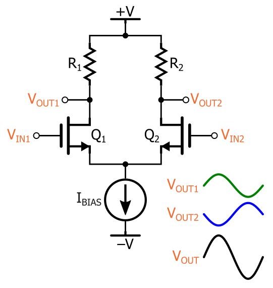 If you have read The Basic MOSFET Differential Pair, you might remember that we analyzed the overall gain differentially, meaning the output signal was defined as VOUT1 – VOUT2. These two signals are 180° out of phase, so the amplitude of the resulting output signal is doubled.