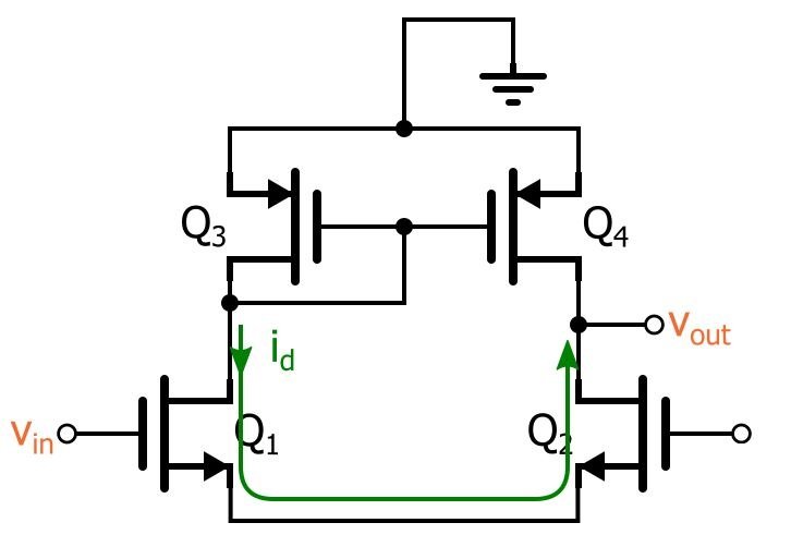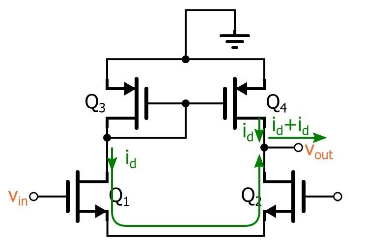 So we have id flowing up toward the output node. But let’s not forget about the active-load current mirror—assuming that the two current-mirror FETs have the same width-to-length ratio, Q4 will duplicate Q3’s drain current, as follows: