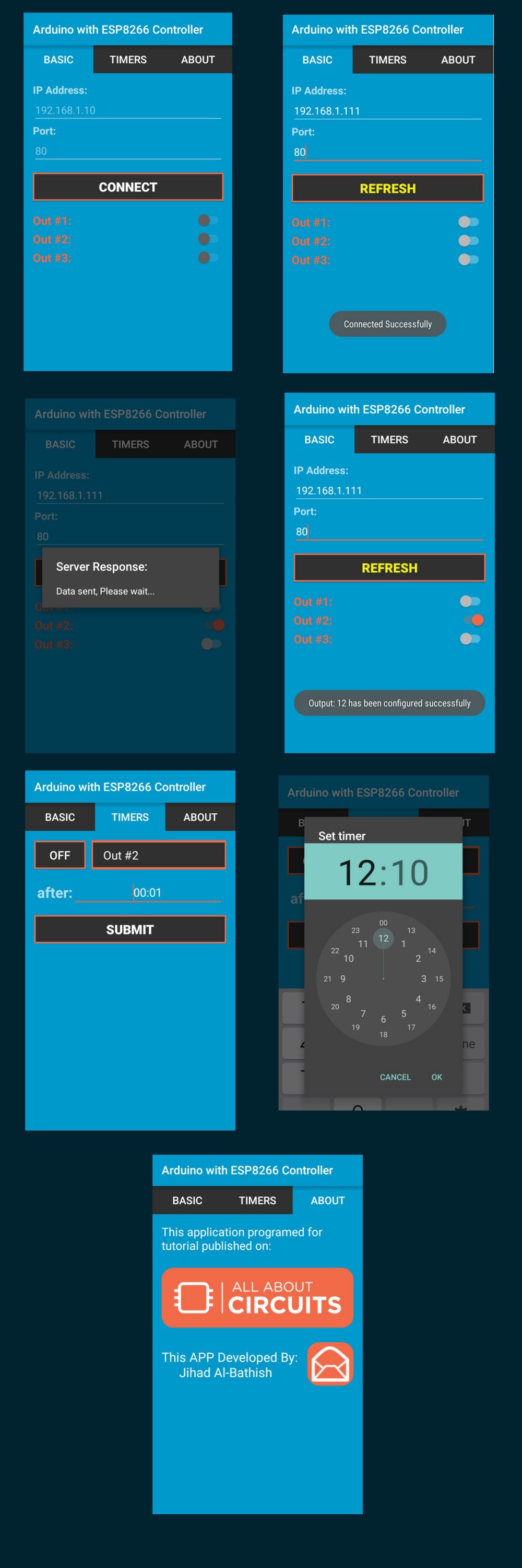 To control all of the above hardware components, we will use a simple Android application. This application will allow us to turn the output on or off directly or after a specific period of time.
