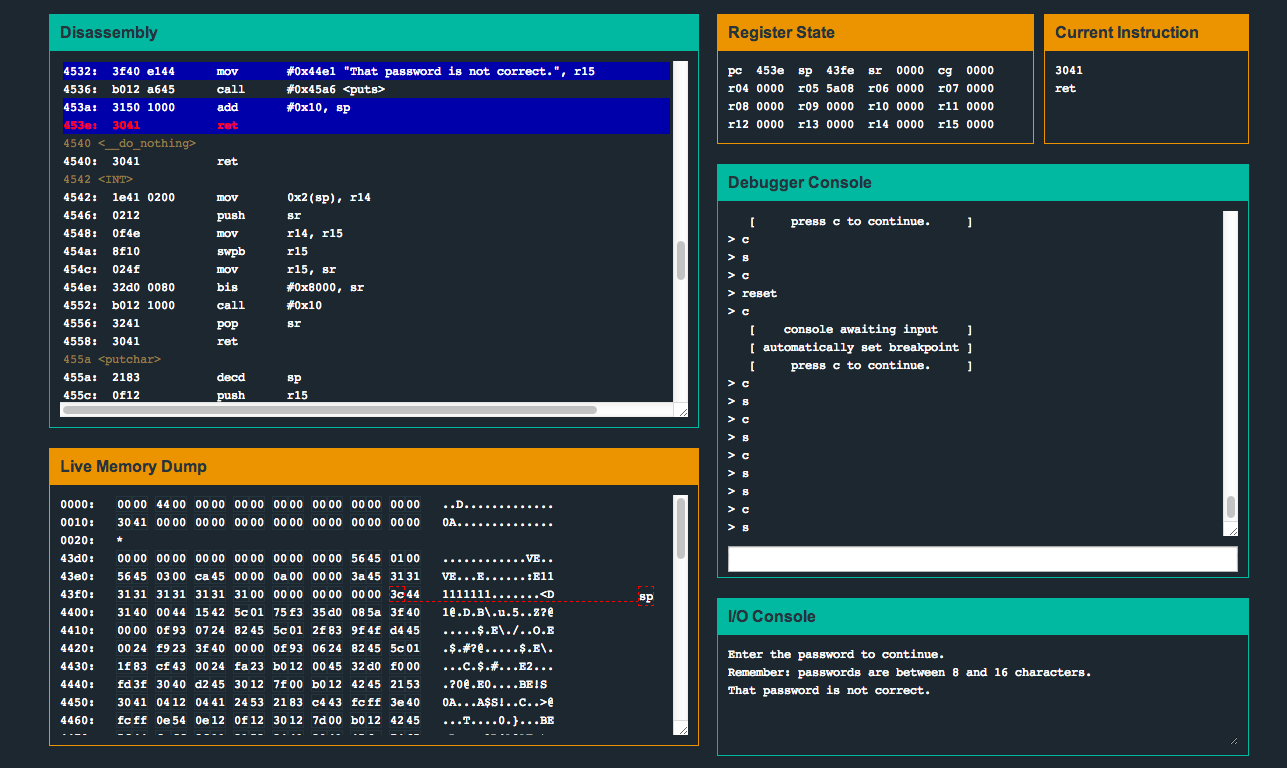 Built around the MSP430's instruction set, MicroCorruption builds a narrative around a realistic JTAG debugger, buffer overflows, and memory corruption. This isn't some Hollywood high-tech mumbo-jumbo, although the “Lockitall LockIT Pro” device you're trying to hack is fake; as you travel to different locales in the game, you are actually learning how to reverse firmware a real CPU. These skills can come in handy no matter what color hat you wear.