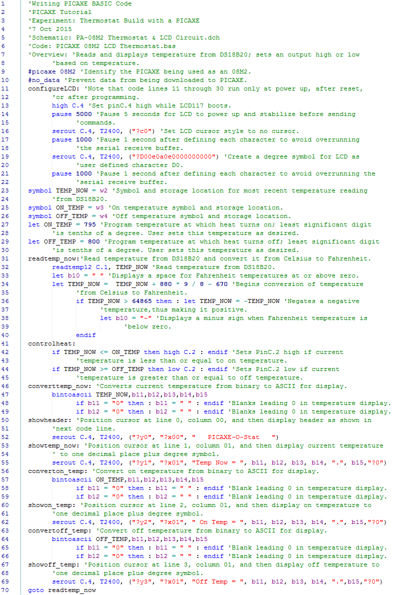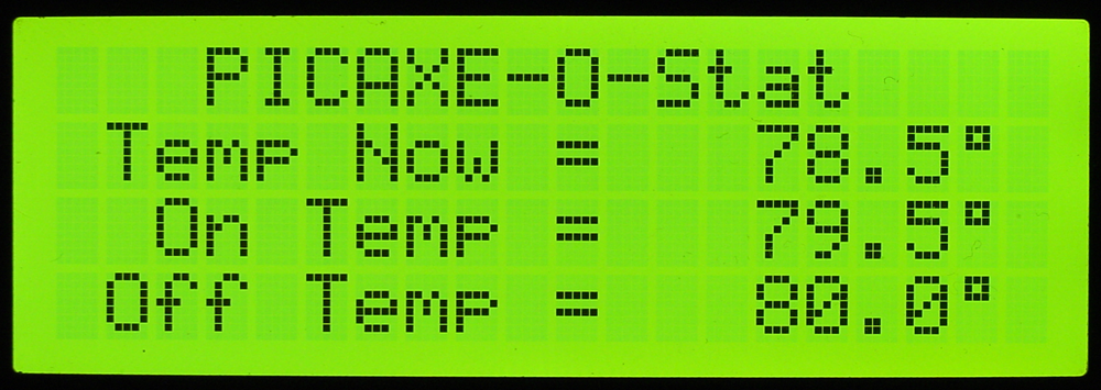 "What about the on and off setpoints? How do I change that?" Once again, the answer is in the code; just change lines 27 and 29 to whatever temperatures you want, and reprogram the PICAXE.