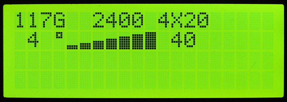 The eight custom characters are in the second line of the display: the degree symbol (º) followed by the seven vertical bars. All eight of those are in the non-volatile memory section of the serial controller, and will remain there until they are reprogrammed.