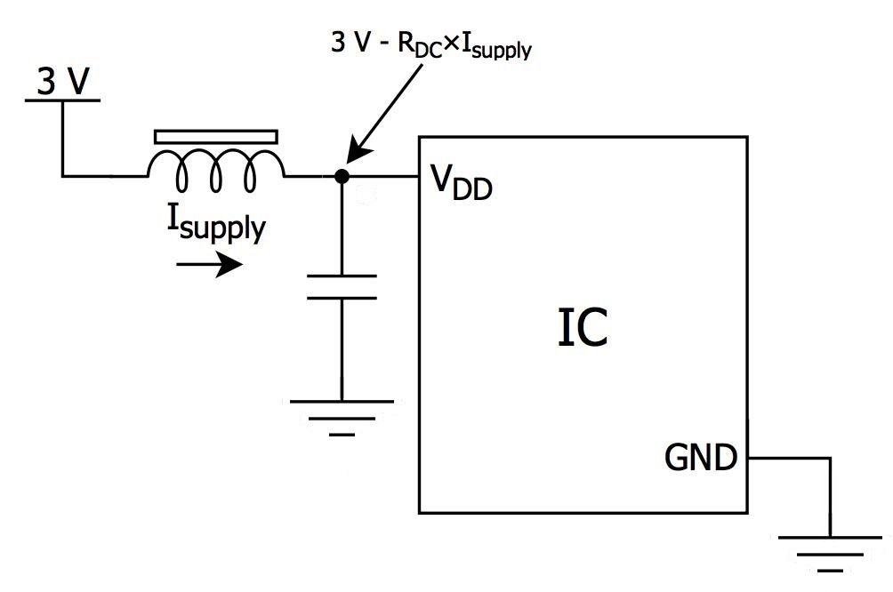 A ferrite bead’s DC resistance—much less than an ohm for typical surface-mount parts—is rarely an issue in this age of low-power ICs. But this is precisely where you can get into trouble: if you don’t check the DC resistance spec, or if you get into the habit of throwing the same ferrite bead in front of every IC, you might not notice that an unusually high-power device could draw enough current to cause a problem. Imagine, for example, that you happen to choose a part with fairly high DC resistance, say 0.7 Ω, and that you are using one bead to filter a 1.1 V core supply connected to multiple power pins on a high-performance digital signal processor. Maybe everything is fine during normal operation, but if that processor enters a period of intense computational activity and draws 400 mA through the bead, your 1.1 V core supply just decreased to 0.82 V. This temporary, operation-dependent power supply deviation could lead to the sort of intermittent failure mode that is notoriously difficult to diagnose.