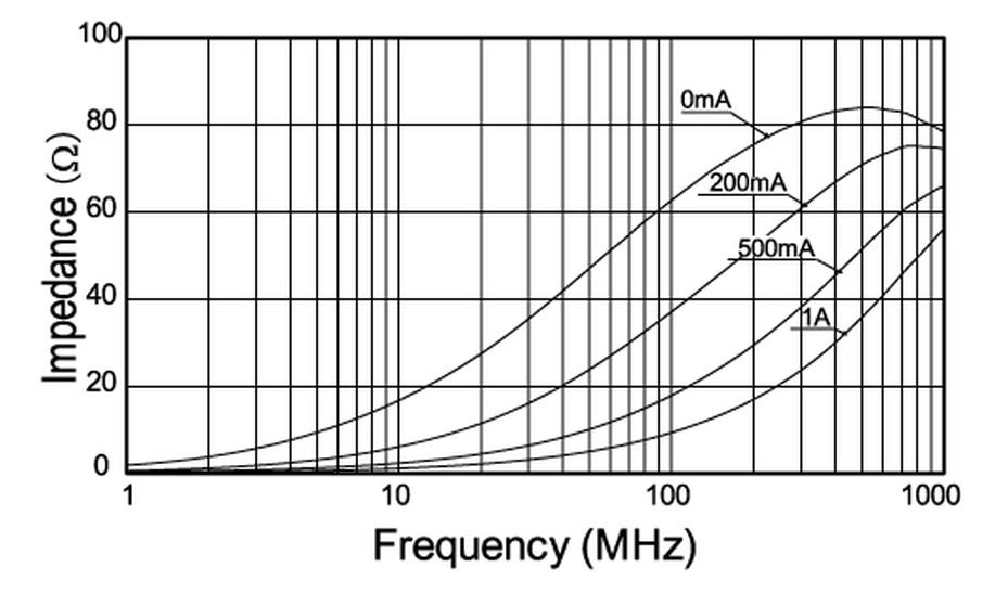 This is the derating curve for the Wurth part discussed in the previous article. The precipitous decline beginning at 85°C should make it abundantly clear that you need to choose your ferrite beads very carefully if your system will be subjected to high temperatures. Second, DC currents well below the rated maximum can degrade the bead’s performance because the ferrite material becomes “saturated.” Ferrite saturation reduces the bead’s peak impedance and shifts the impedance curve toward higher frequencies, as shown in the following plot from Murata:
