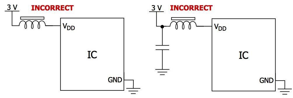 At this juncture we should point out a good way to sabotage your IC, namely, using a ferrite bead without a capacitor between the power pin and ground: