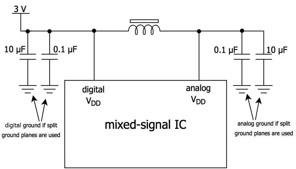 The FBC low-pass filter is potentially beneficial for any IC that is particularly sensitive to high-frequency noise on the power line. But notice something else: the ferrite bead will also form an FBC filter with any capacitance on the other side of the bead, including the bypass capacitors attached to other ICs on the same power rail. Thus, ferrite beads help to suppress not only noise going into the IC but also noise coming out of the IC. This means that ferrite beads are particularly valuable for decoupling in PCBs with multiple digital components, because they tend to isolate each IC from noise generated by all the other ICs.