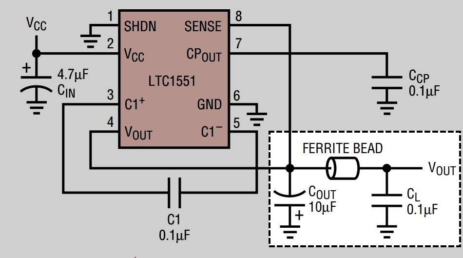 Another time to consider ferrite beads is when you would rather use one filter at the power supply instead of individual filters attached to multiple ICs. This is an effective approach for a circuit in which a noisy DC/DC converter provides power for several analog components, which are sensitive to noise but usually do not generate large amounts of noise. A standard configuration for such a filter is a ferrite bead with a capacitor on either side; ideally the datasheet for the DC/DC converter would provide guidance on component values and other details. For example, Linear Technology recommends the following for the LTC1551, which is an inverting charge-pump regulator: