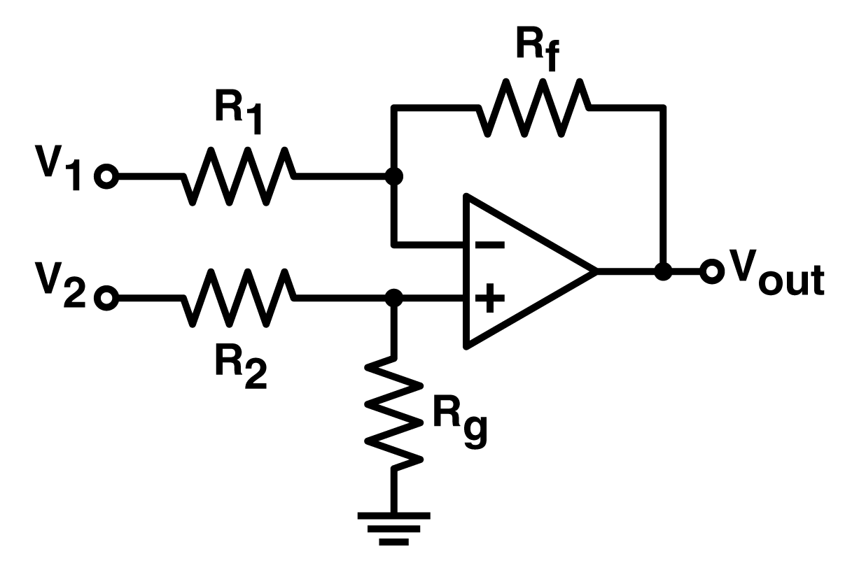 This setup might be adequate for some differential applications; it can amplify a bridged signal and can have good CMRR, but it has a few problems. First off, we can clearly see that the input impedances do not approach infinity; in fact the input resistance on the inverting input is relatively low. The input impedances in this configuration do not match, and there can sometimes be very large differences in input impedance when compared to the non-inverting input. This setup also requires very careful resistor matching and source impedance balancing. Sure, we could increase the input impedance by making the feedback resistors very large, but a 1M Ohm R1 and R2 would require Rf and Rg to be 100M Ohm just to achieve a gain of 100; amplifying very small signals usually takes more than that. Using large resistors also raises new problems. Large resistors are noisy, and it is very difficult to match large resistors with much accuracy; in addition, large resistors can cause stray capacitance which will negatively affect the CMRR at high frequencies.