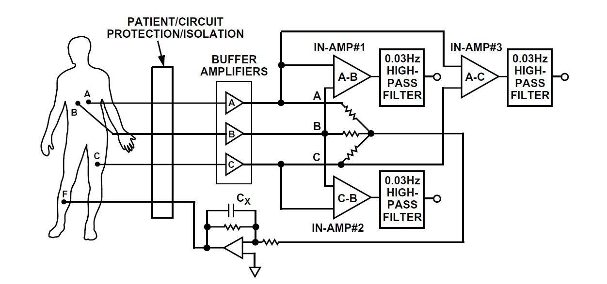 All three instrumentation amps extract the signal differences from sensor electrodes, while the last electrode “F” acts as a ground. Instrumentation amps are used for this device because the biopotential electrodes pick up a huge amount of power line noise, which needs to be rejected so the device can give accurate readings.